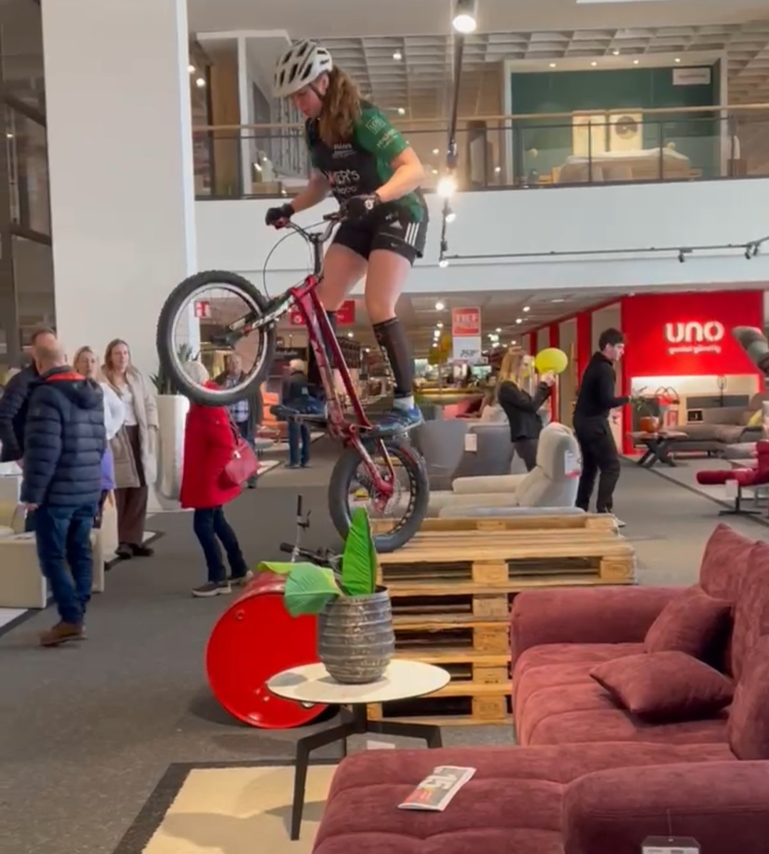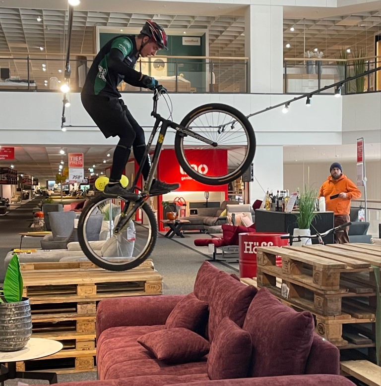 Es wurden zwei kleine Shows gefahren, in denen Paul Höffs und Celina Römmelt ihr Können zur Schau stellten. Die Veranstaltung wurde durch Tom Volkmann moderiert und den anwesenden Möbelhauskunden dadurch ein wenig nähergebracht, was man denn da mit den komischen Fahrrädern ohne Sattel so alles veranstaltet.