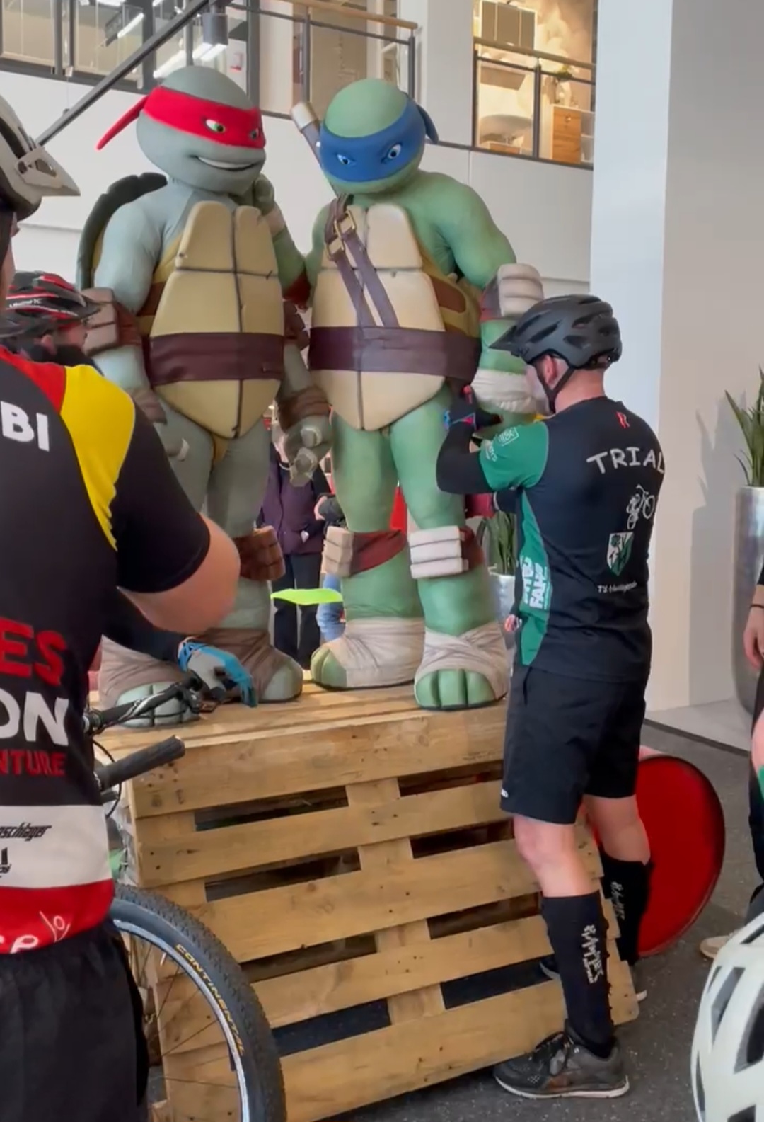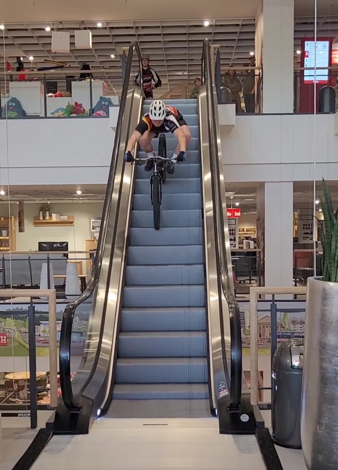 Neben der durchaus gelungenen Veranstaltung konnten endlich mal ein paar Dinge ausprobiert werden, die man schon immer mal machen wollte… Kann man eine Rolltreppe auf dem Fahrrad hoch und wieder herunterfahren? Kann man in einem Fahrstuhl auf dem Hinterrad springen ohne sich den Kopf zu stoßen? Fällt man wirklich weicher, wenn man auf ein Ausstellungssofa fällt? … Wir konnten alle Fragen mit einem „JA“ beantworten.