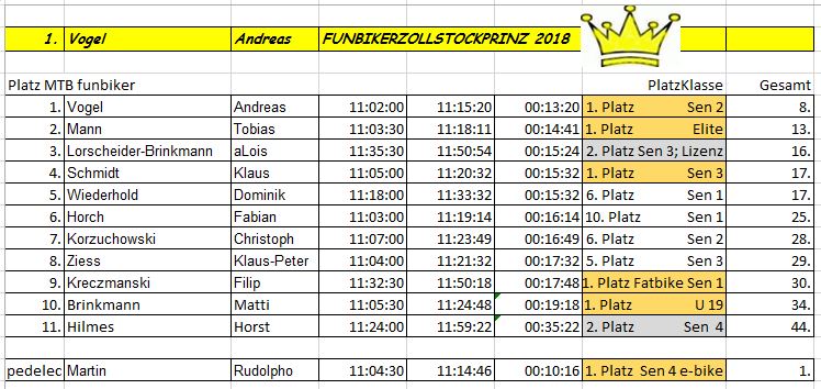 Doch diesmal war alles anders. Es wurde an den Bikes getunt und jedes Gramm rausgekitzelt ( weniger als 9 kg waren keine Seltenheit ). Außerdem wurde am Körpergewicht gearbeitet ( zumindest versucht !!! ). Monatelang wurde gestichelt und gepusht, was das Zeug hielt, und das nur zum Spaß versteht sich. Zusätzliche Trainingseinheiten ( meist geheim ) waren ebenfalls hier und dort zu beobachten. Nun, die Sache trug jedenfalls Früchte und in der Tat hat sich was getan, denn 6 x einen 1. Platz und auch die folgenden Platzierungen zeigen, dass alle schneller waren, als im Vorjahr. Es ist doch Wahnsinn, was Biergartengespräche bewirken können. Das war eine Superleistung. Ein Riesendank geht an die Organisatoren Helmut Mauer und Alois Lorscheider Brinkmann und deren Helfern. Ebenfalls einen Riesendank an die tolle Bewirtung von W. Dedecke und das Naturparkmobil mit reichlich Infos für die Kids. Herzliche Gratulation an den wiederholten Zollstockprinz- Andreas Vogel für die tolle Leistung.