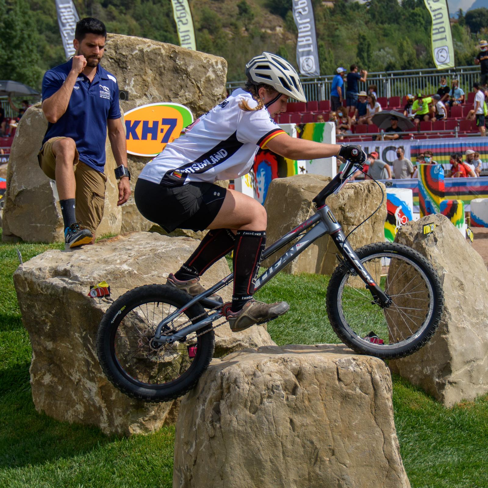 Vom 01. bis 05. September 2021 fand im spanischen Vic, in der Nähe der katalonischen Metropolstadt Barcelona, die diesjährige Fahrradtrial WM statt. Aufgrund der Corona-Pandemie mit entsprechenden Hygienekonzepten fand die Fahrradtrial WM, zum ersten Mal in ihrer Bestehensgeschichte, ohne eine andere Radsportdisziplin statt. Der spanische Radsportverband war jedoch auch in Pandemiezeiten sehr aktiv und hat – mit gewissen Auflagen – trotz der Corona-Pandemie viele Prädikatswettkampfe im Fahrradtrial veranstaltet. Davon profitieren die spanischen Fahrer enorm und sorgten damit für das erfolgreichste spanische Ergebnis aller Zeiten. Bei der diesjährigen Fahrradtrial WM gewannen die Spanier fünf von möglichen sechs Goldmedaillen. Lediglich der Titel in der Kategorie Elite 26“ ging an den 25 jährigen Engländer Jack Carthy (sechsfacher Weltmeister), der seit 2012 auf jedem WM-Podium stand – RESEPKT! Team Deutschland reiste, neben TSV Trialerin Celina Römmelt, mit drei amtierenden Weltmeistern an. Dieses Jahr reichte es aber „nur“ für eine Silbermedaille und Bronze beim Teamwettbewerb. Für Celina Römmelt, die Dritte der Deutschen Meisterschaft, war die Nominierung für die Trial WM schon der erste Teilerfolg. Das Niveau bei der diesjährigen WM war extrem hart und Celina kam in den meisten Sektionen an ihr fahrerisches Limit. Hinzu kamen extrem heiße Wetterbedingungen und das technische Versagen ihrer Vorderradbremse. In den fünf Wertungssektionen, die alle dreimal durchfahren werden mussten, hat sie mit einem geliehenen Ersatzrad von Runde zu Runde besser in den Wettkampf gefunden. Erfreulicherweise war, dass die letzte Sektion die beste Sektion ihres Wettkampfes war. Am Ende landete sie auf dem 19. Platz. Auf der Ergebnisliste war zwar noch Luft nach oben, aber sie ging mit einem guten Gefühl aus dem Wettkampf. Jetzt heißt es schnell wieder Kräfte sammeln, für den einzigen Weltcup der Saison in Frankreich, bevor die Outdoorsaison dann so langsam auf das Ende zugeht.